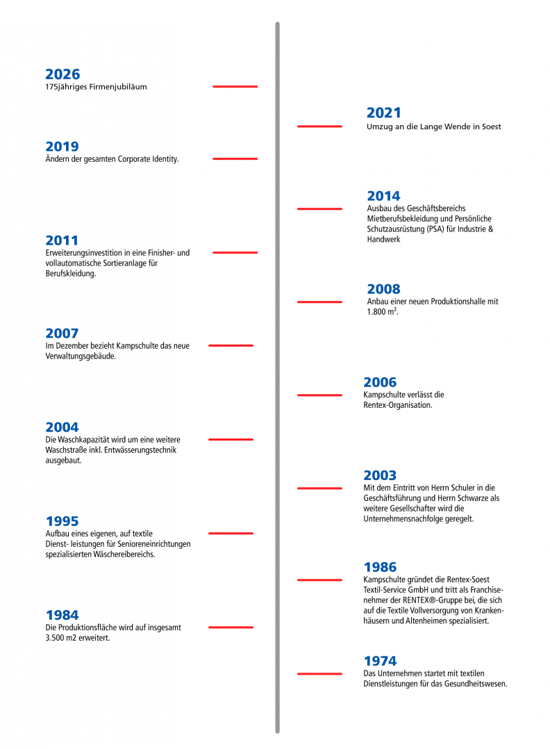 Seit 1851 beschäftigt sich Kampschulte mit Textilien aus verschiedenen Bereichen. Zunächst als Färberei gegründet, aber ab 1897 auch mit eigener Wäscherei und Reinigung auf dem Markt tätig. 1917 wurde der Firmensitz in den neu gebauten Betrieb am Oelmüllerweg in Soest verlegt. 1974 entwickelte sich das Unternehmen in Richtung Gesundheitswesen weiter und bot dort auch die textile Dienstleistung an. 10 Jahre später vergrößerte Kampschulte das Produktionsgelände auf 3.500 m². 2007 wurde dann in selbiger Straße das neue Verwaltungsgebäude bezogen. In der Zwischenzeit wurden eine dritte Waschstraße und ein spezieller Bereich für Altenheimwäsche eingerichtet. Im darauffolgenden Jahr wurde die Produktionshalle neu erbaut und kurz danach bekam der Produktionsprozess ein Upgrade mit einer Finisher- und Sortieranlage. In den Folgejahren erfolgten weitere An- und Umbauten, bis im Jahr 2020 entschieden wurde, den Betrieb zu verlegen. 2021 erfolgte der Umzug vom Oelmüllerweg an die Lange Wende in Soest. Im Zuge dieses Umzugs wurde der gesamte Produktionsbetrieb mit modernsten Maschinen ausgestattet.